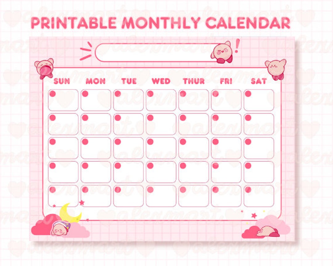 Pink Kirby Monthly Calendar Printable (digital Download) Etsy