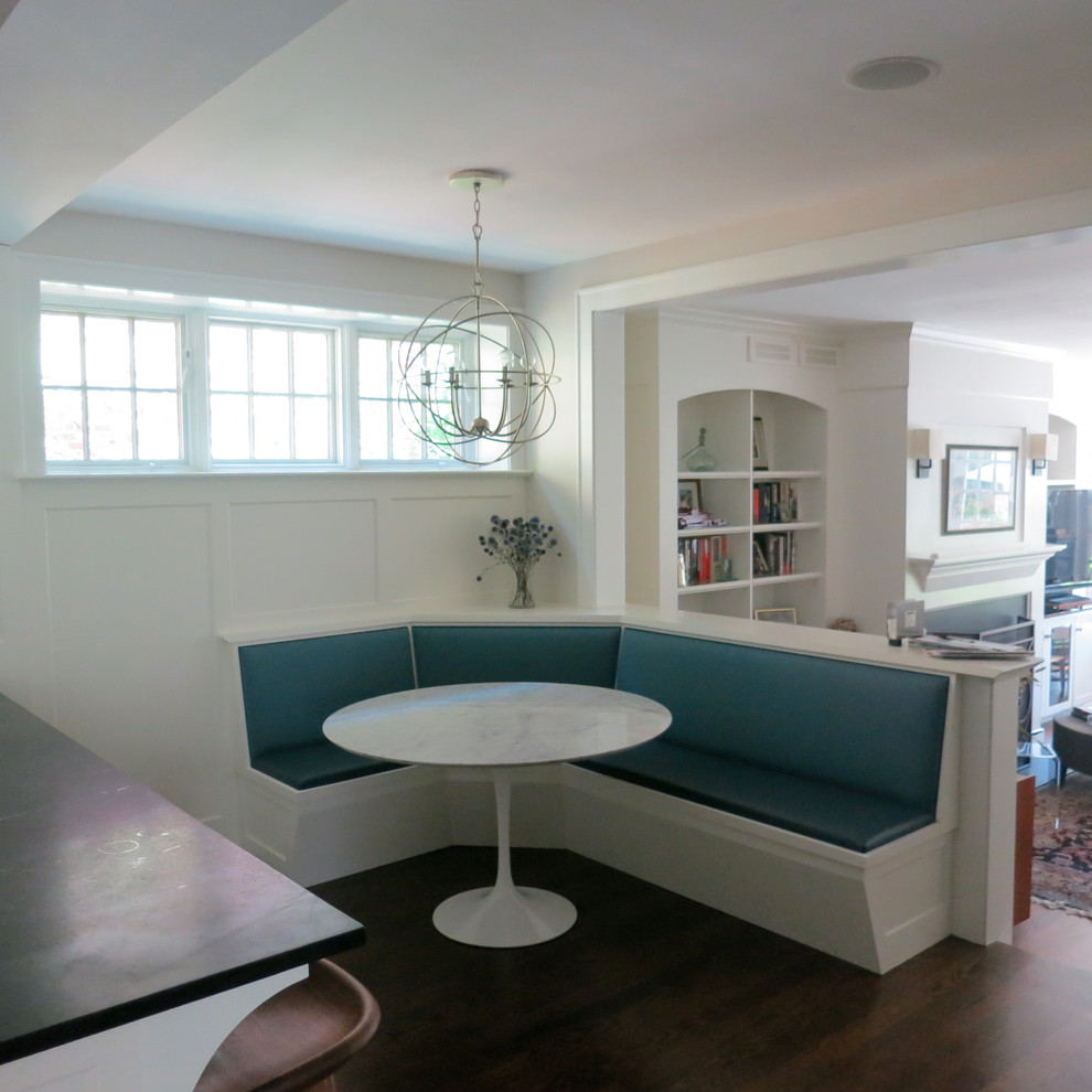 Kitchen and dining space with a banquette seating in a renovated 1930s