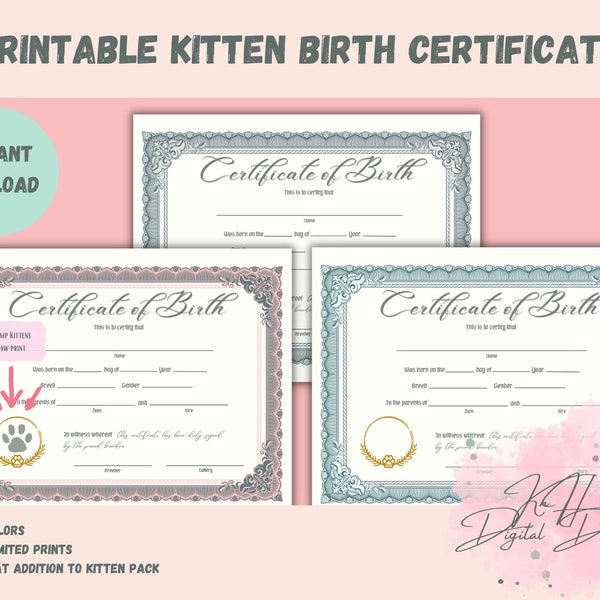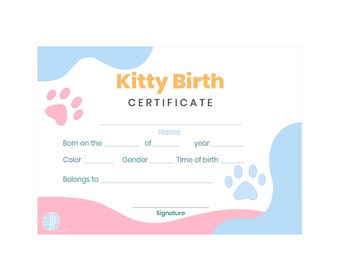 Kitten Birth Certificate Printable Cat Birth Pet Certificate dog Owner