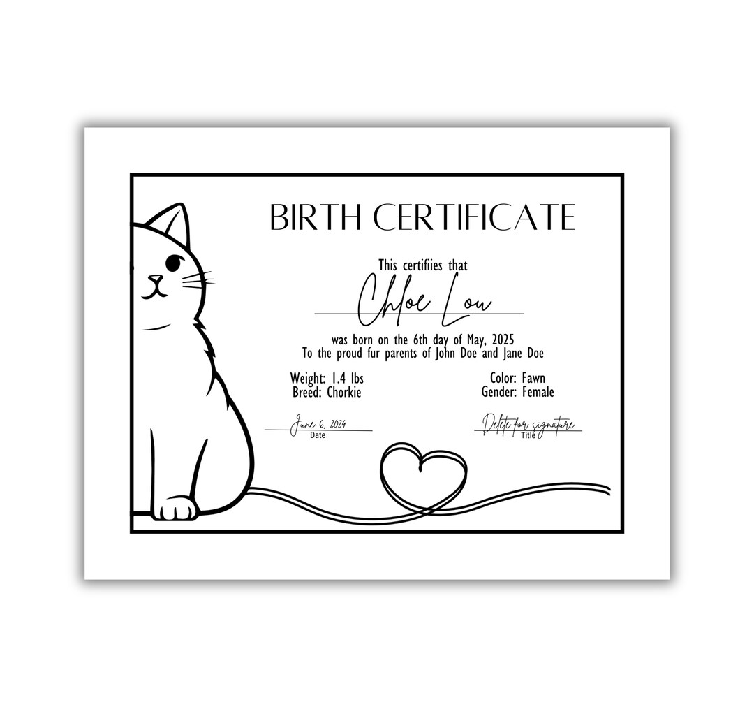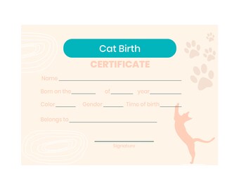 Printable Cat Birth Certificate Pet Document Cat Adoption Document