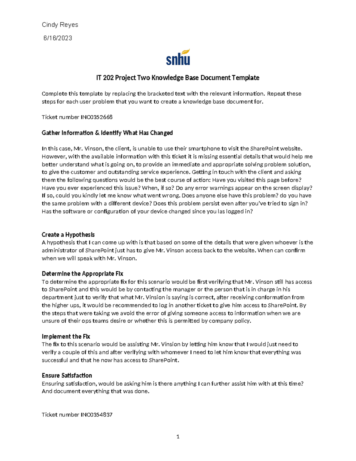IT 202 Project Two Knowledge Base Document Template Phone call one