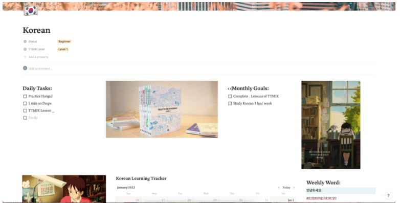 Korean Learning Dashboard Notion template Learn korean Notes