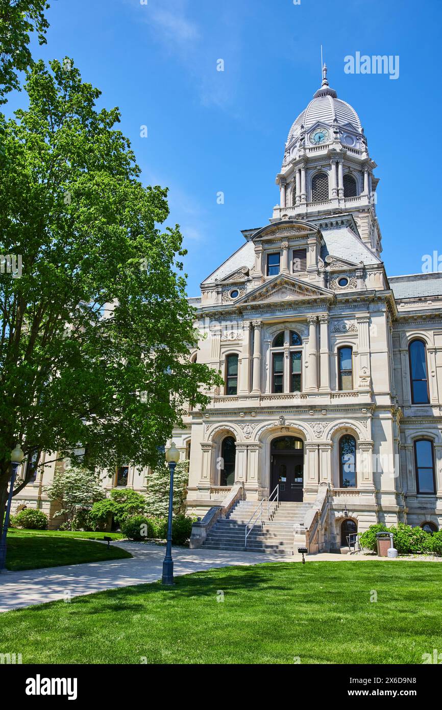 Historic Kosciusko County Courthouse with Lush Greenery Eye Level View