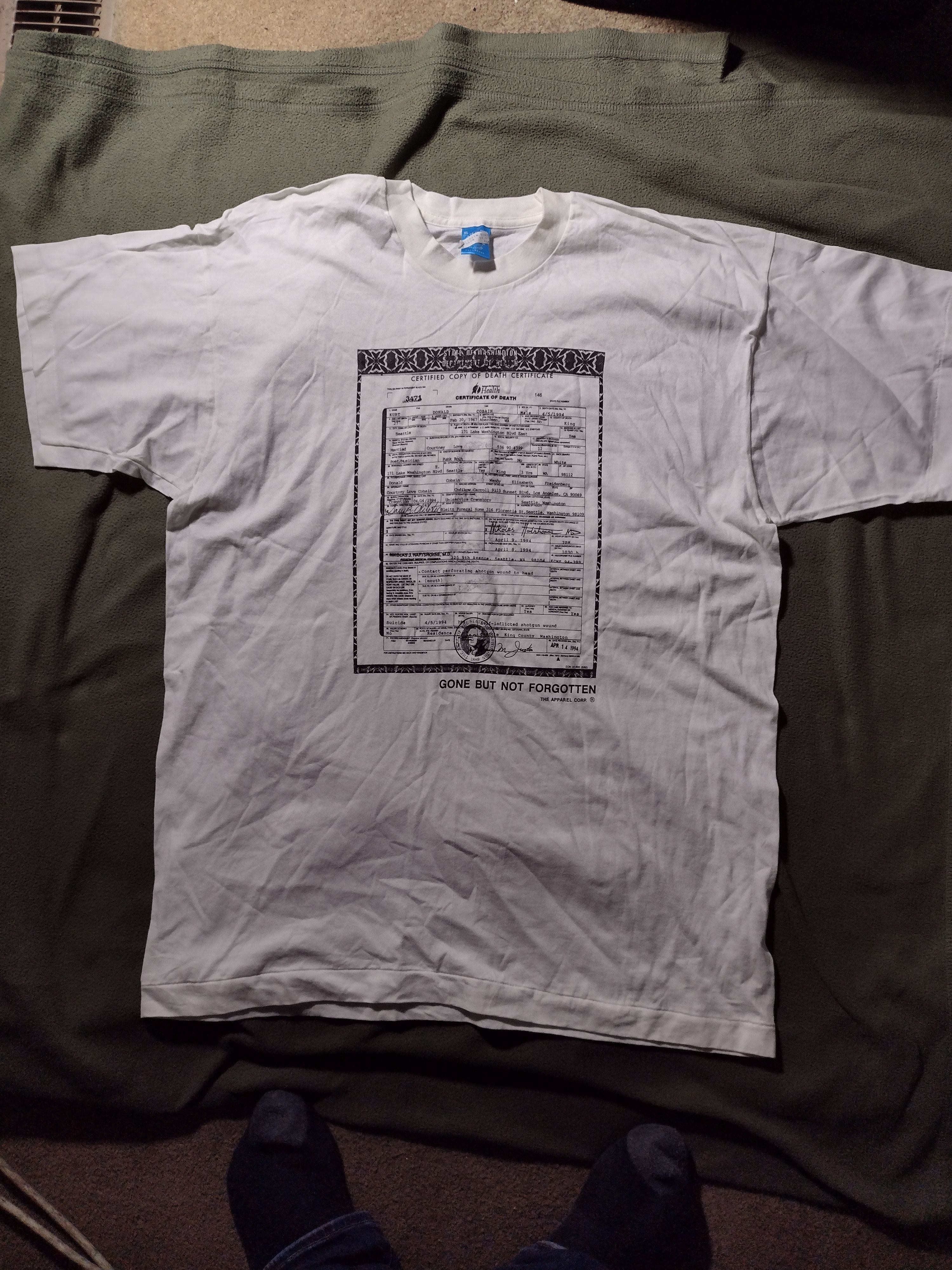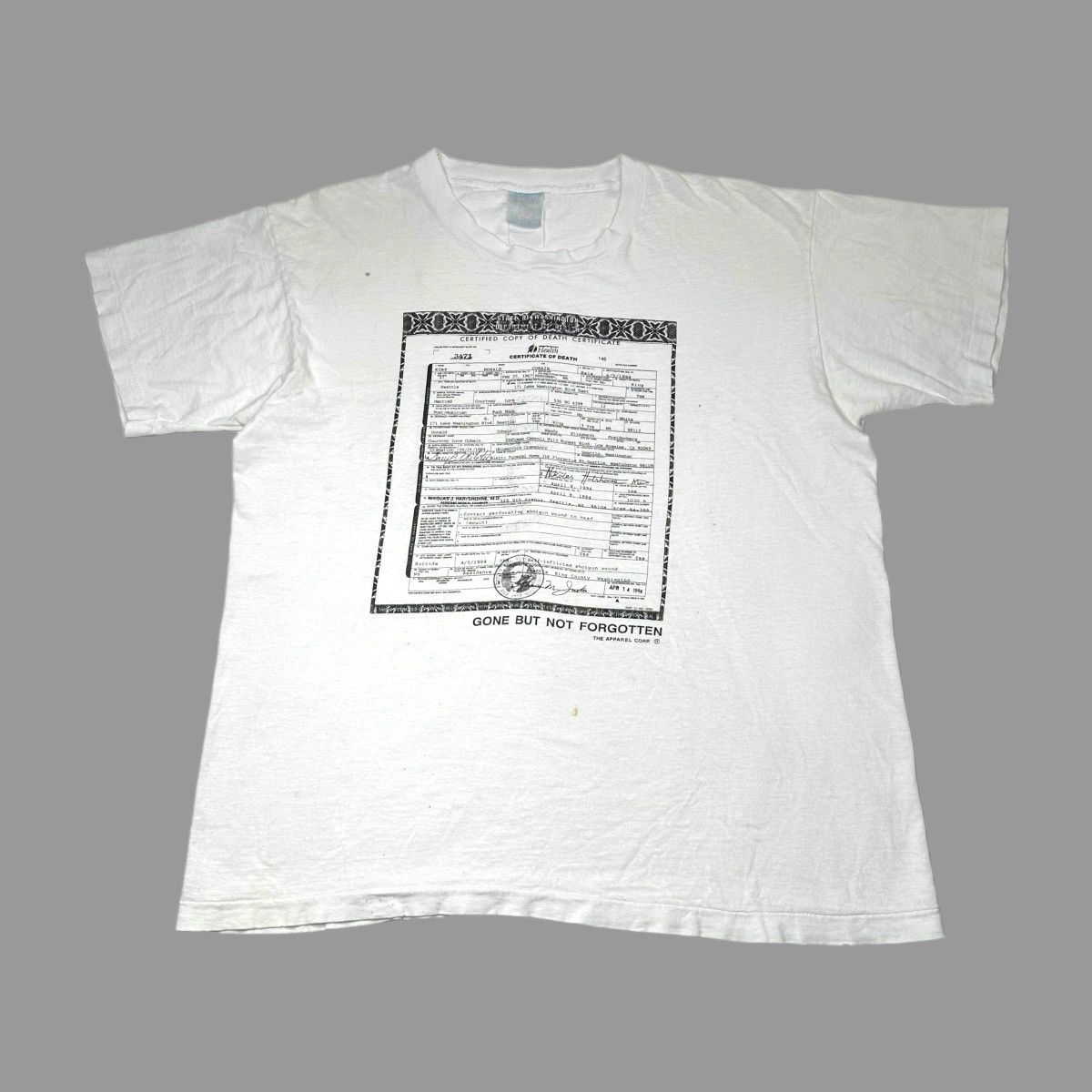 VERY RARE VINTAGE NIRVANA KURT COBAIN DEATH CERTIFICATE TEE SHIRT X