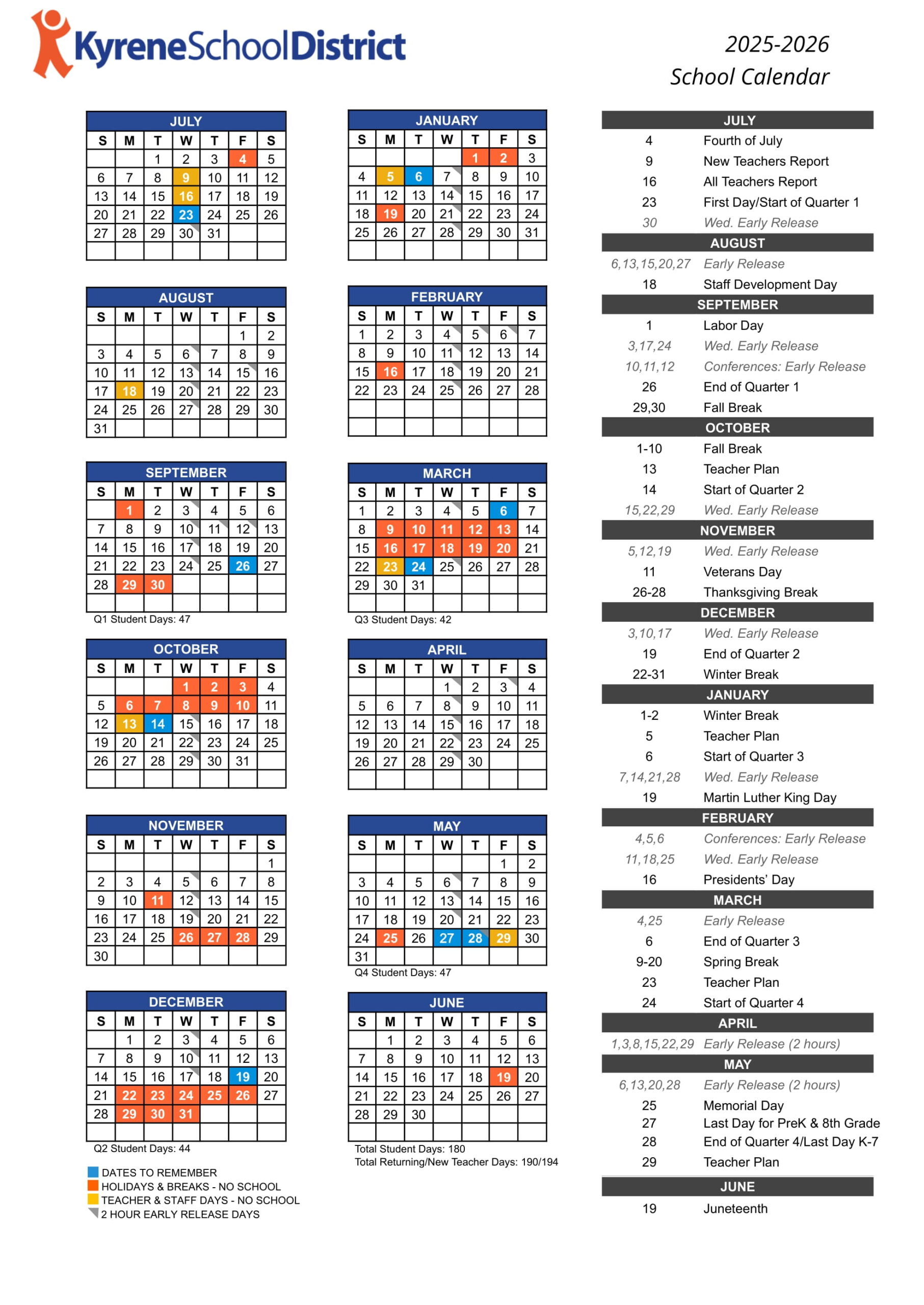 Kyrene School District Calendar 2025 2026 in PDF