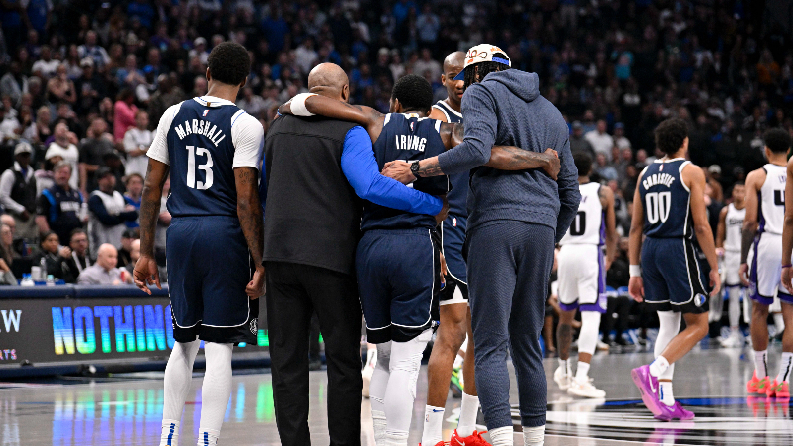 Mavs #39 Kyrie Irving sinks 2 FTs before being helped off court with knee