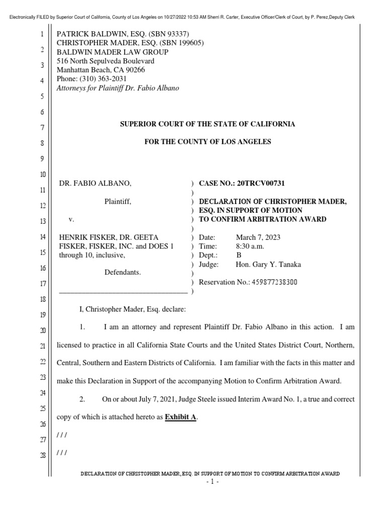 CA LA County Case 20TRCV00731 Albano V fisker LA County Superior