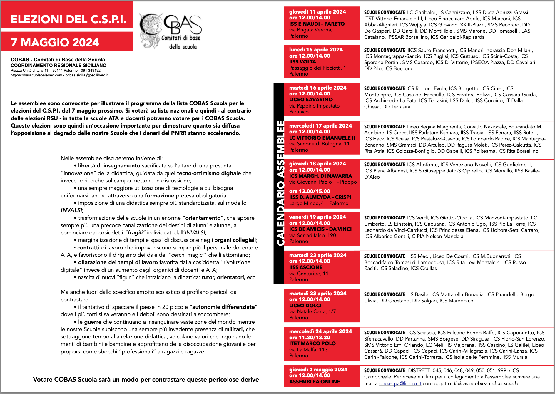 Vota COBAS Scuola alle ELEZIONI C S P I del 7 5 2024 COBAS SCUOLA PALERMO