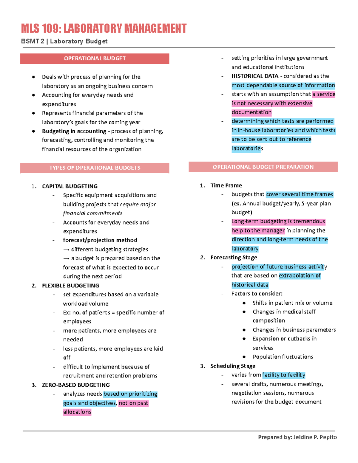 Laboratory Budget MLS MLS 109: LABORATORY MANAGEMENT BSMT 2