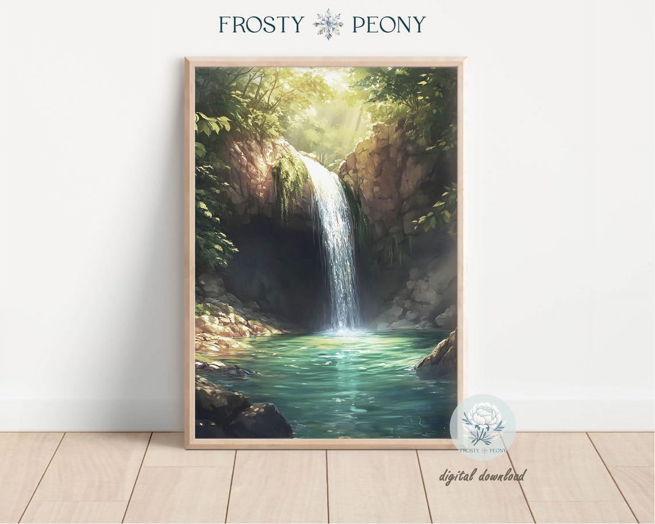 DOPAPRINT Soothing Sunlit Waterfall Art Print Nature Lakeside Scenery