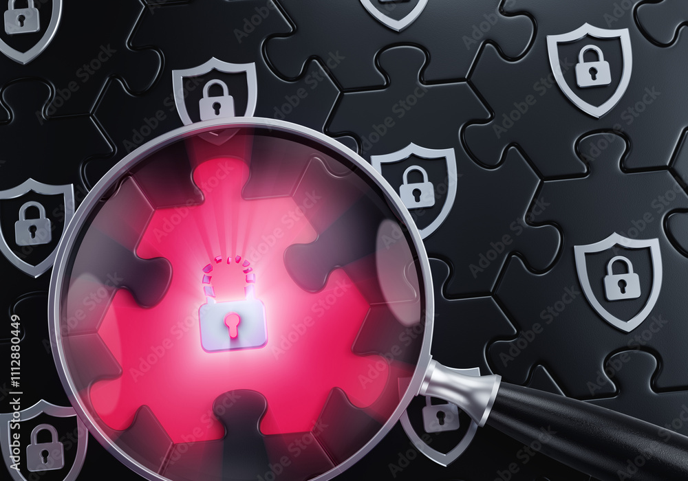 Security Vulnerability Alert A broken padlock under a magnifier among