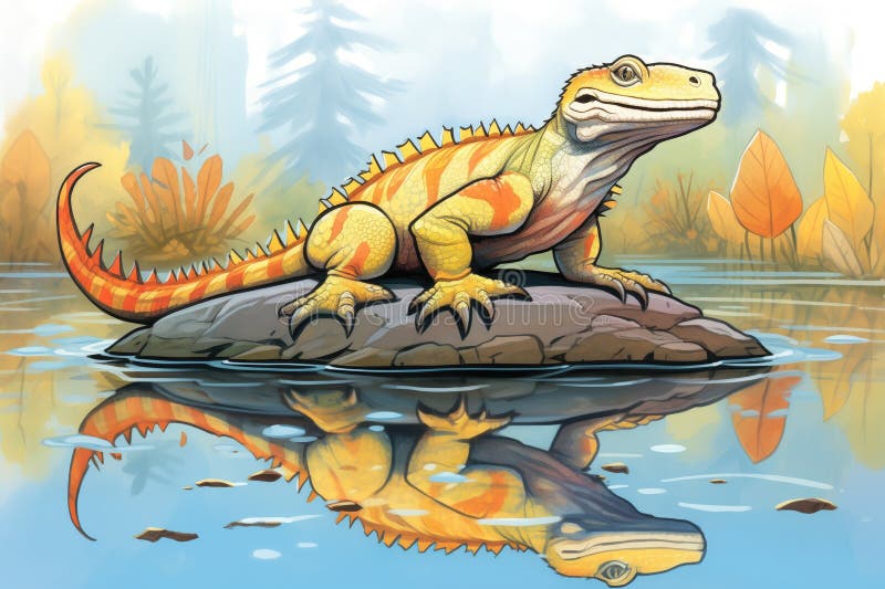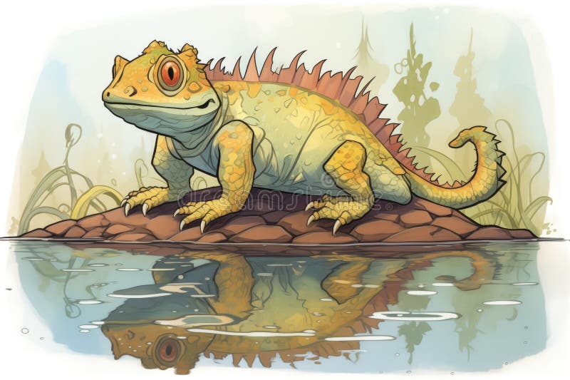 Dynamic Illustration of a Lizard Showing Off a Large Dewlap by the Pond