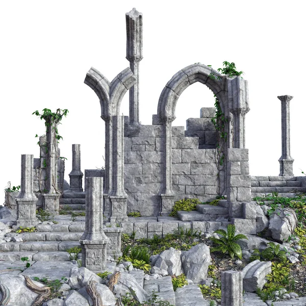 An Ancient Stone Archway With Ruins And Vegetation On Isolated Backdrop