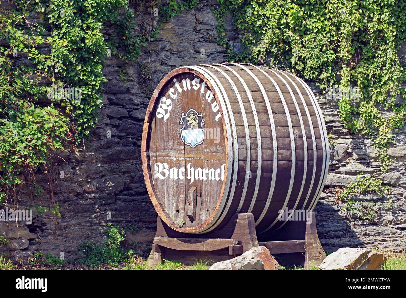 Large wine barrel standing against a stone wall landmark Bacharach