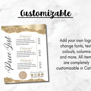 Gold Editable Price List Template Custom Salon Bakery Lash Price List