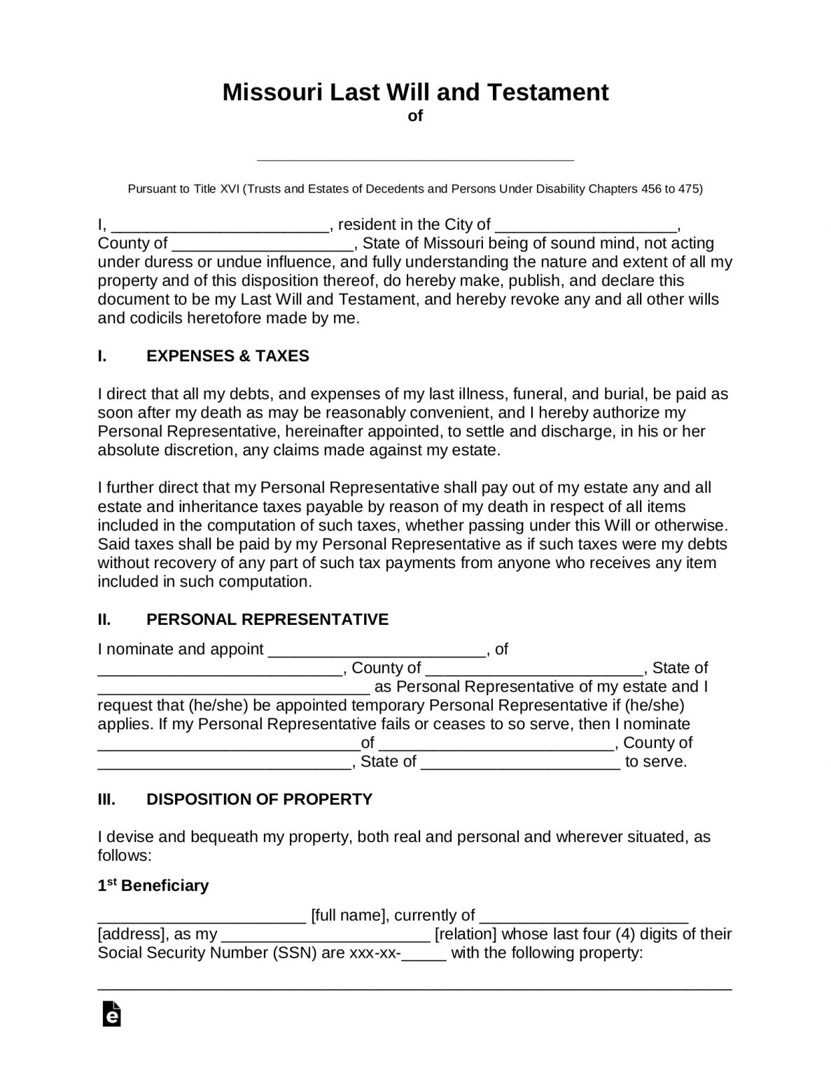 Free Missouri Last Will and Testament Template PDF Word eForms