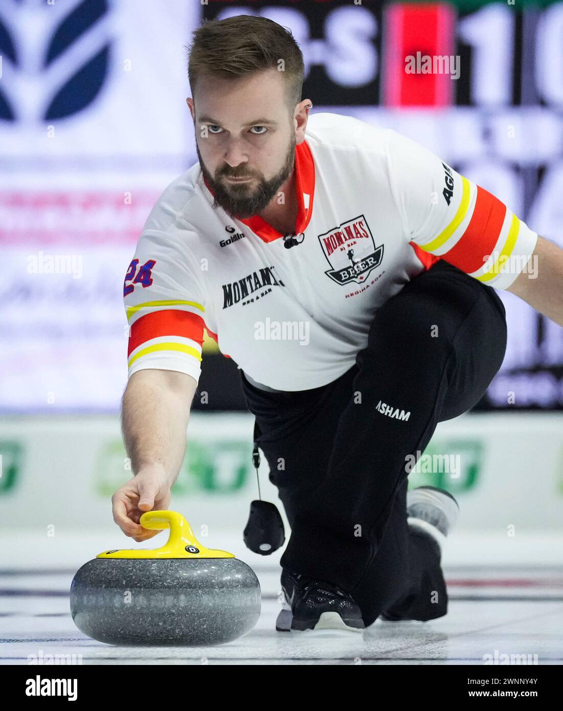 Nunavut skip Shane Latimer delivers a rock while playing Team Alberta