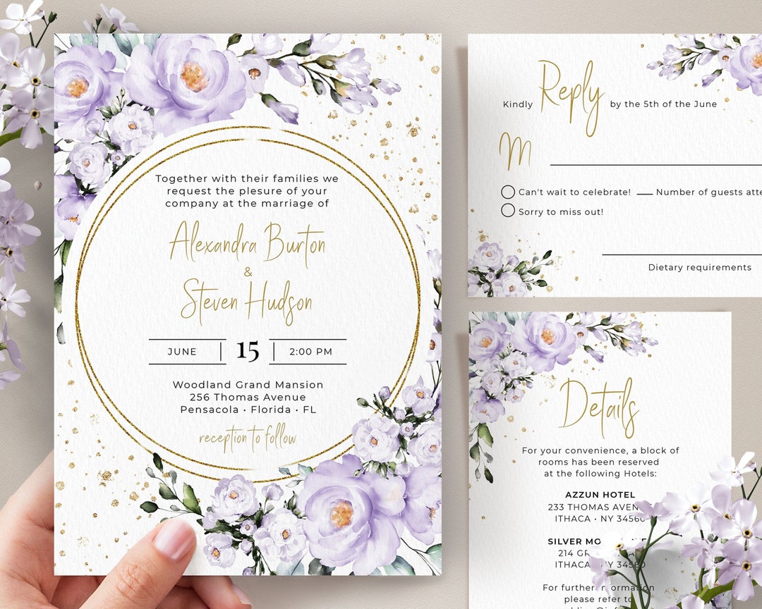 Lavender Floral Wedding Invitation Set Template Lilac Gold Invite