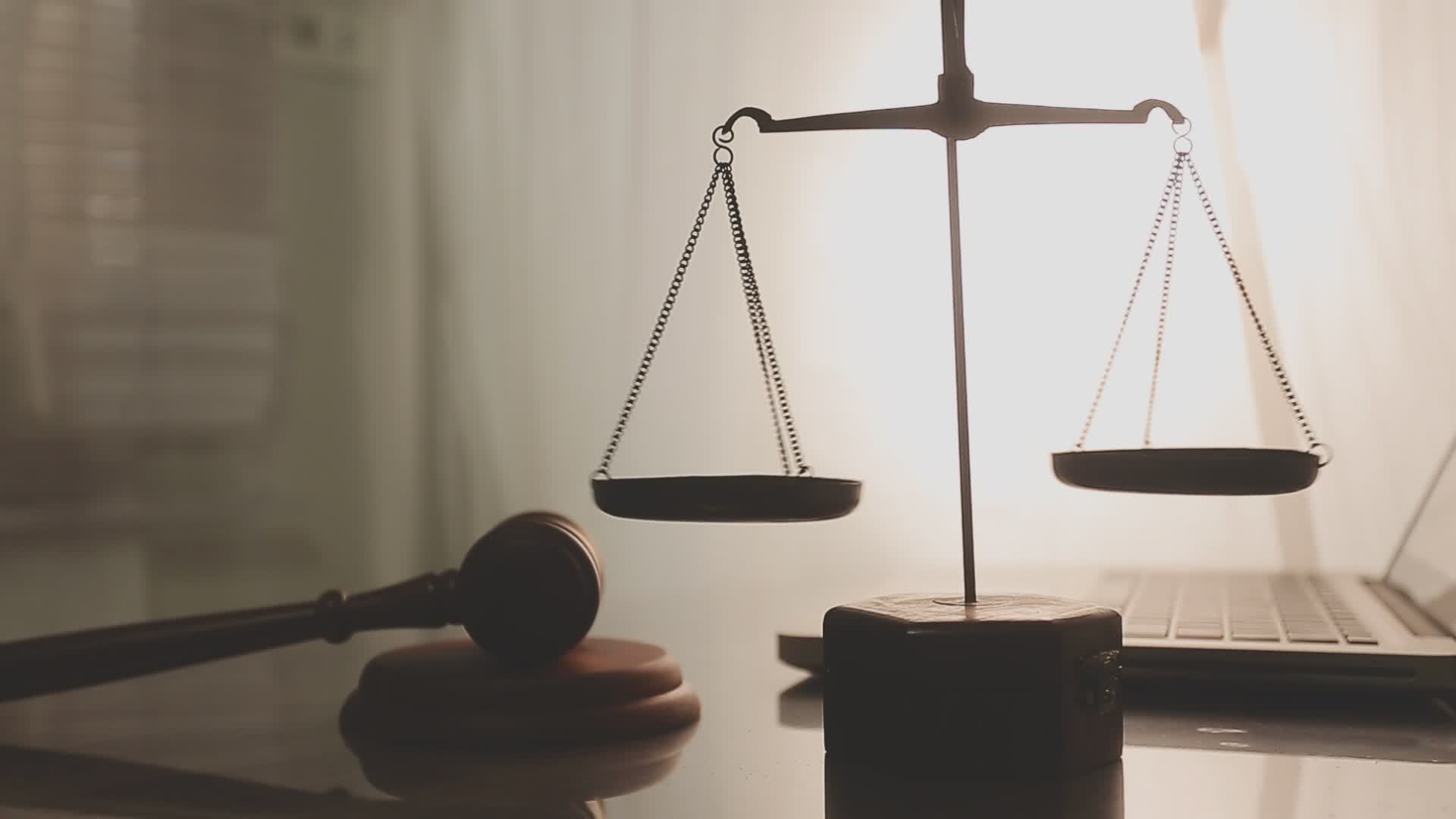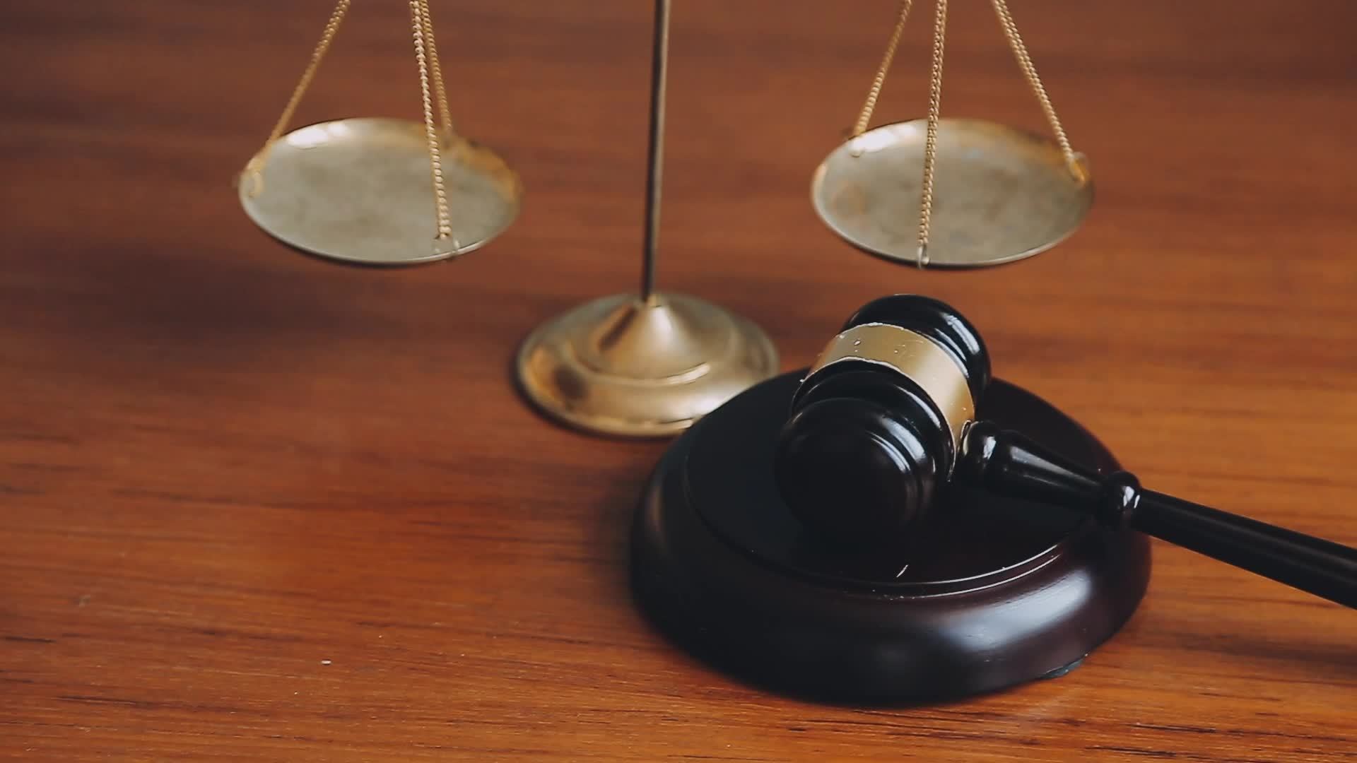 Male lawyer working with contract papers and wooden gavel on tabel in