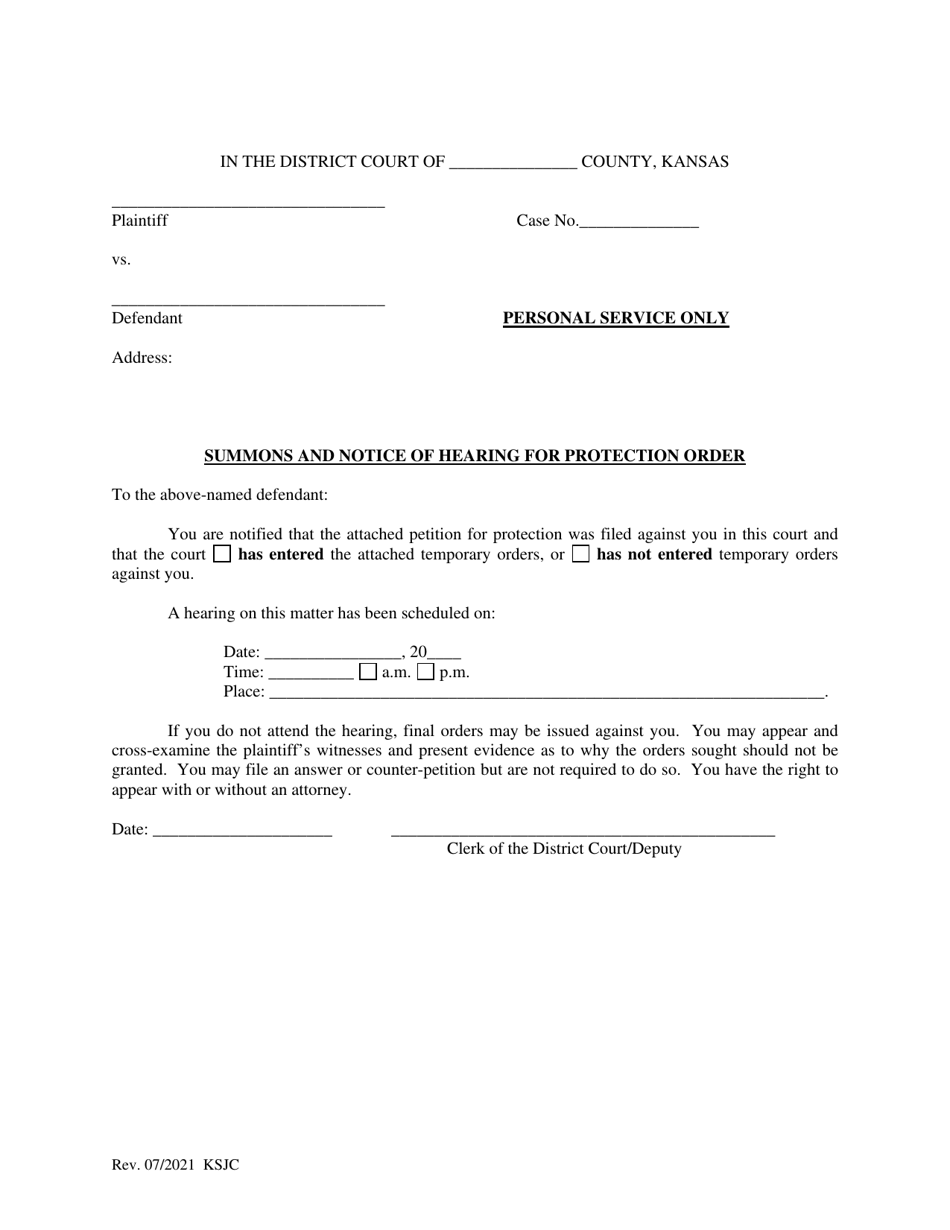 Kansas Summons and Notice of Hearing for Protection Order Download