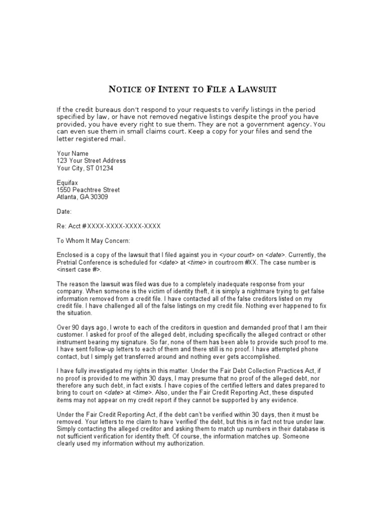 Lawsuit Free Letter Of Intent To Sue Template prntbl