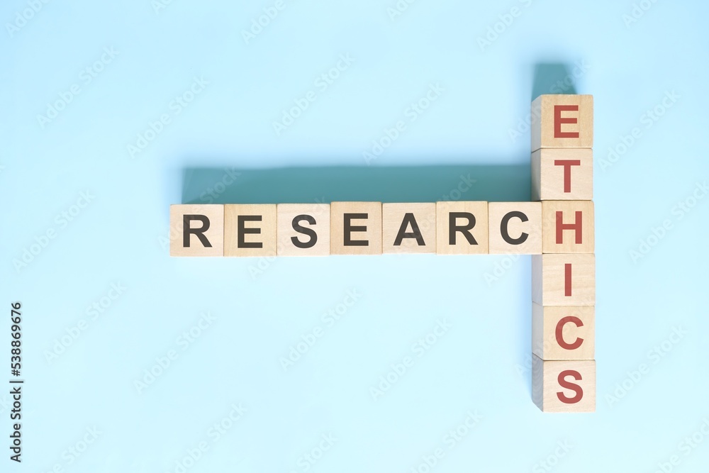 Research ethics concept Crossword puzzle flat lay typography in blue