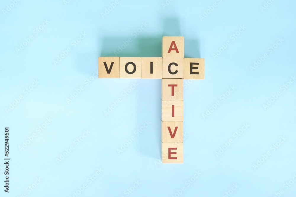 Grammarconcept Wooden block crossword puzzle flat lay in blue
