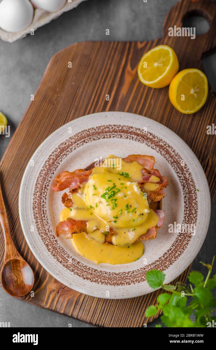 Eggs benedict with bacon hollandaise sauce delish food Stock Photo