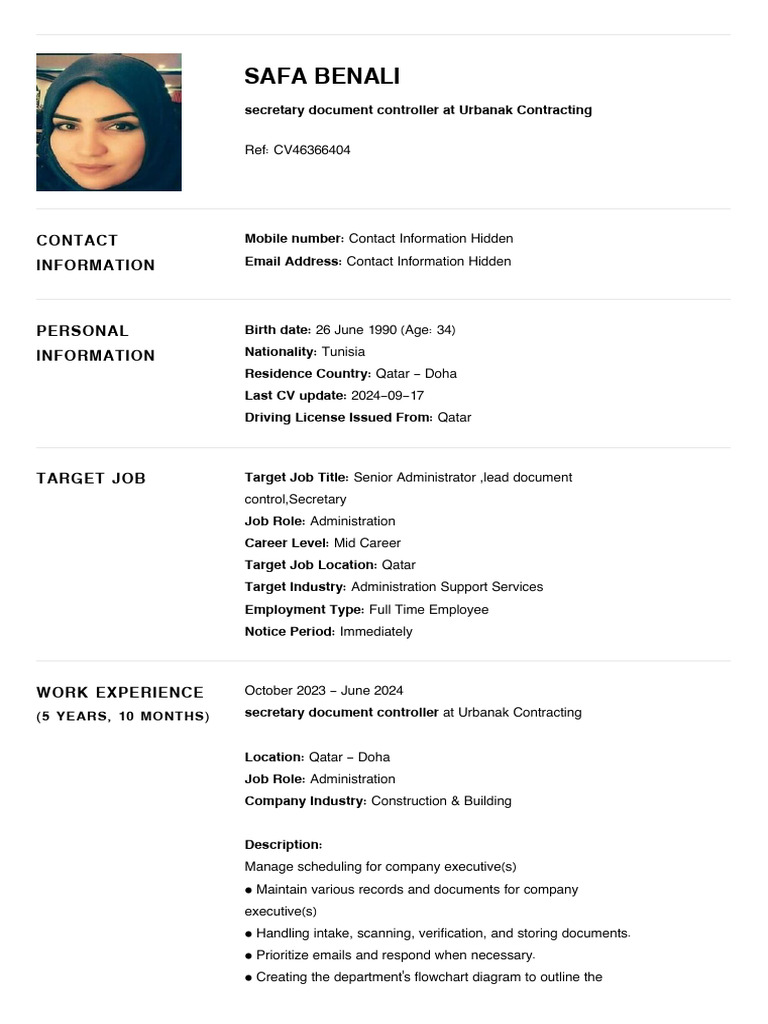 cv46366404 Safa Benali Senior Administrator Lead Document Control