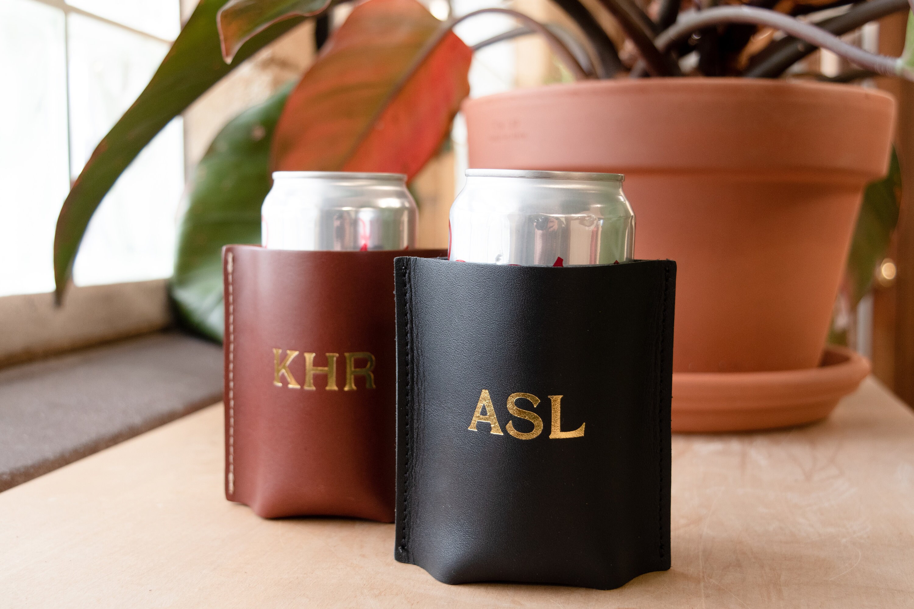 Custom Leather Koozies Can Cooler Sleeves Neoprene Authentic Leather