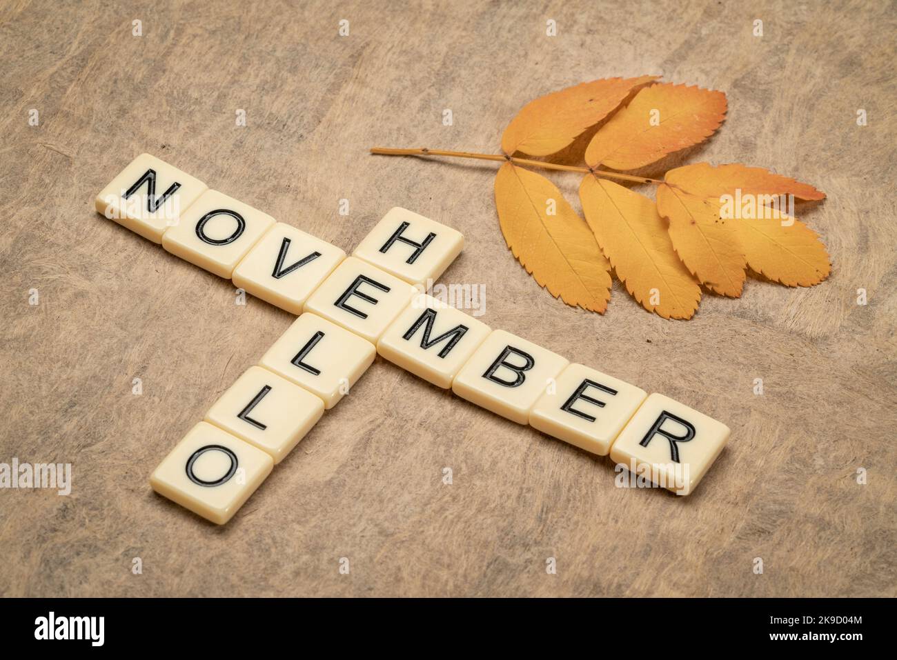 Hello November crossword in ivory letter blocks with a yellow leaf