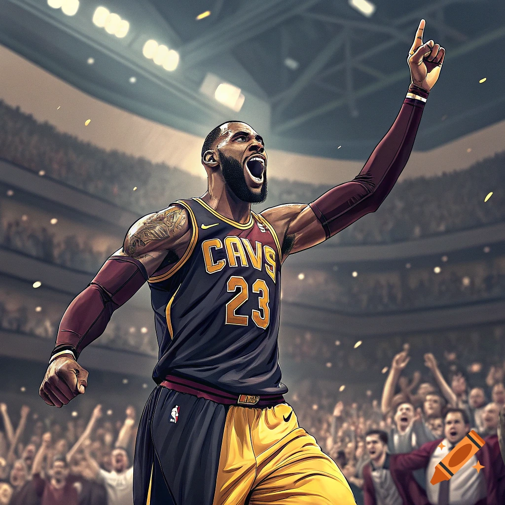 Stylized illustration of LeBron James celebrating in a Cavaliers jersey