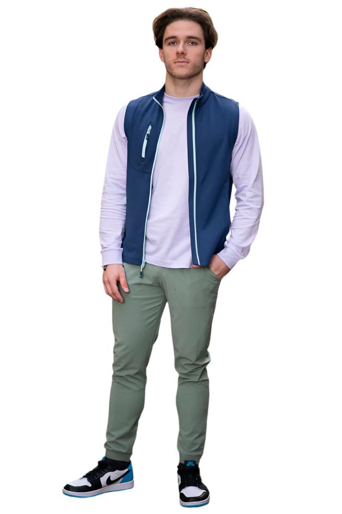 Side view of casual man in sweater walking away looking at camera over