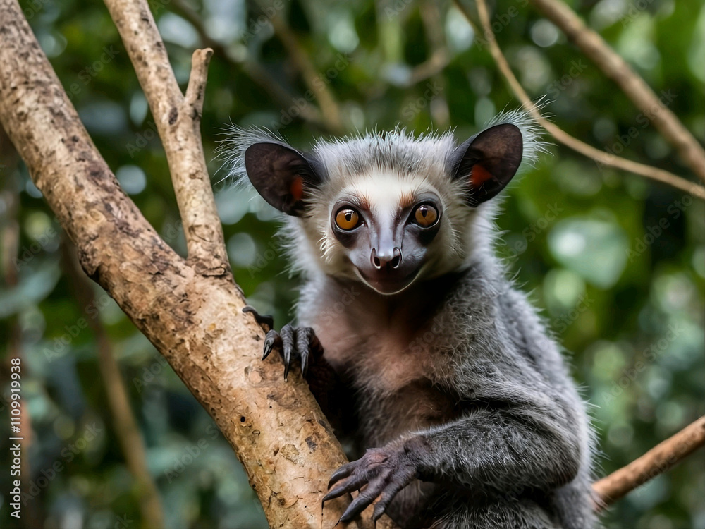 Vibrant eyes glowing in darkness a rare Aye Aye lemur emerges from the