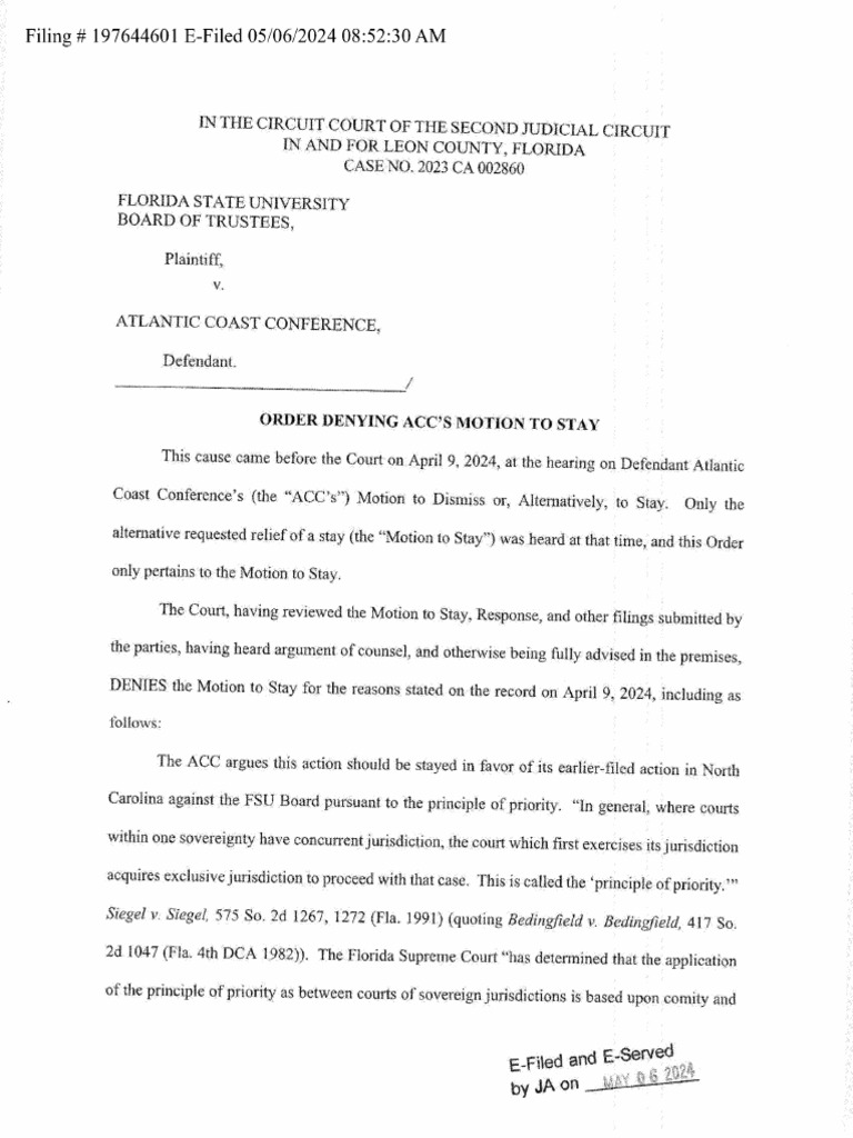 ACC Motion to Stay denied in Leon County Circuit Court PDF