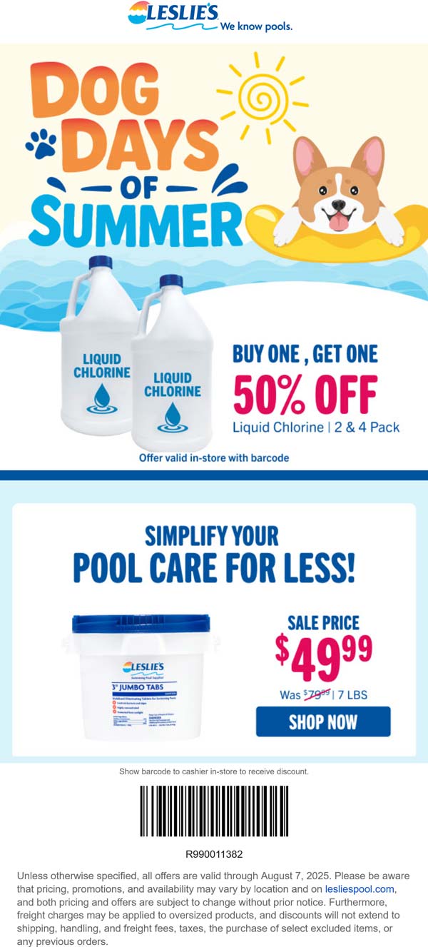 15% off chlorine tabs shock at Leslies Pool Supplies or online via