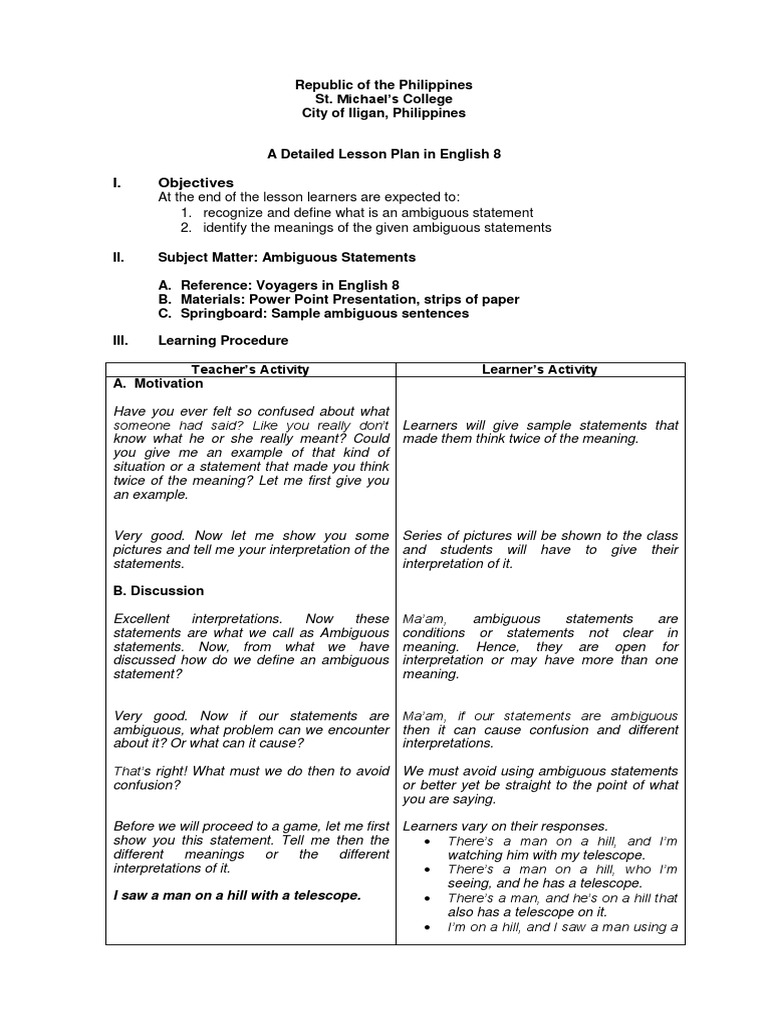 Sample Objectives In Lesson Plan In English Free Printable