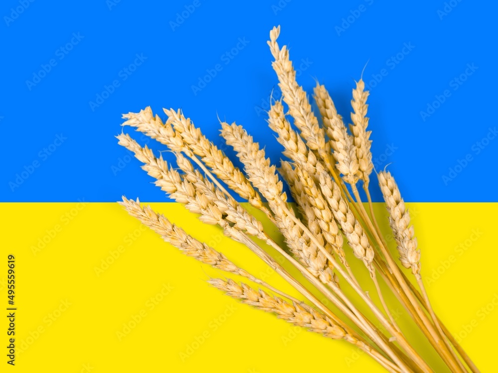 Spike lets of wheat tied with on the background of the flag of Ukraine