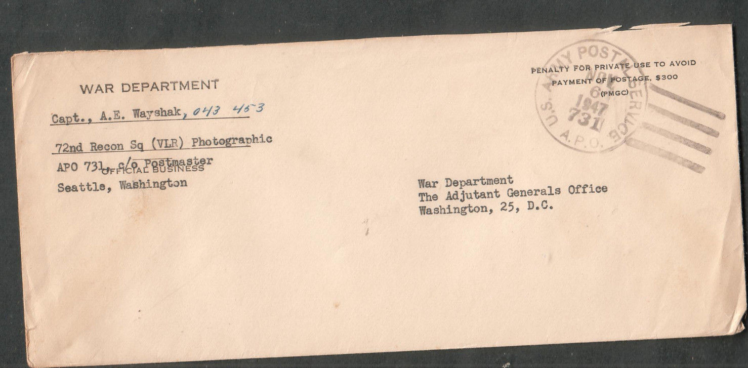 1947 cover Captain A E Wayshak 72nd Recon Sq VLR APO 731 Ladd AFB