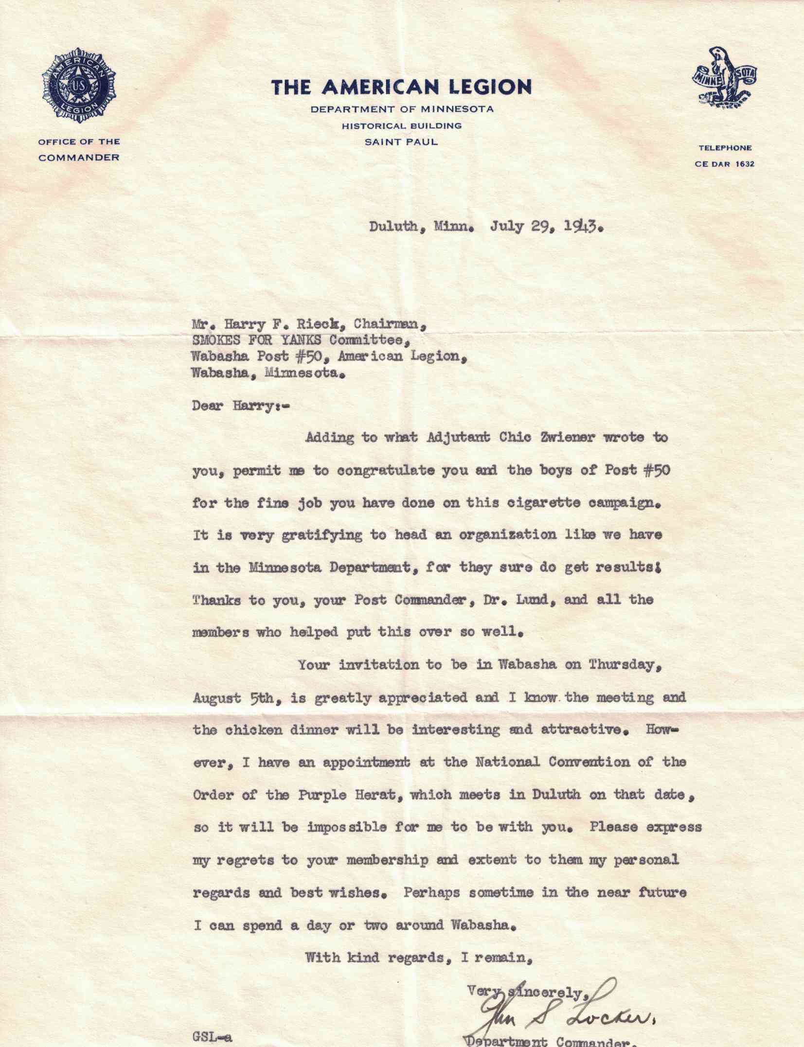 World War 2 Era American Legion Letter quot Smokes for Yanks quot campaign