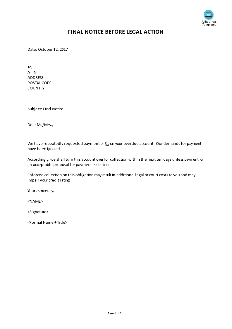 Sample Letter Threatening Legal Action For Non payment