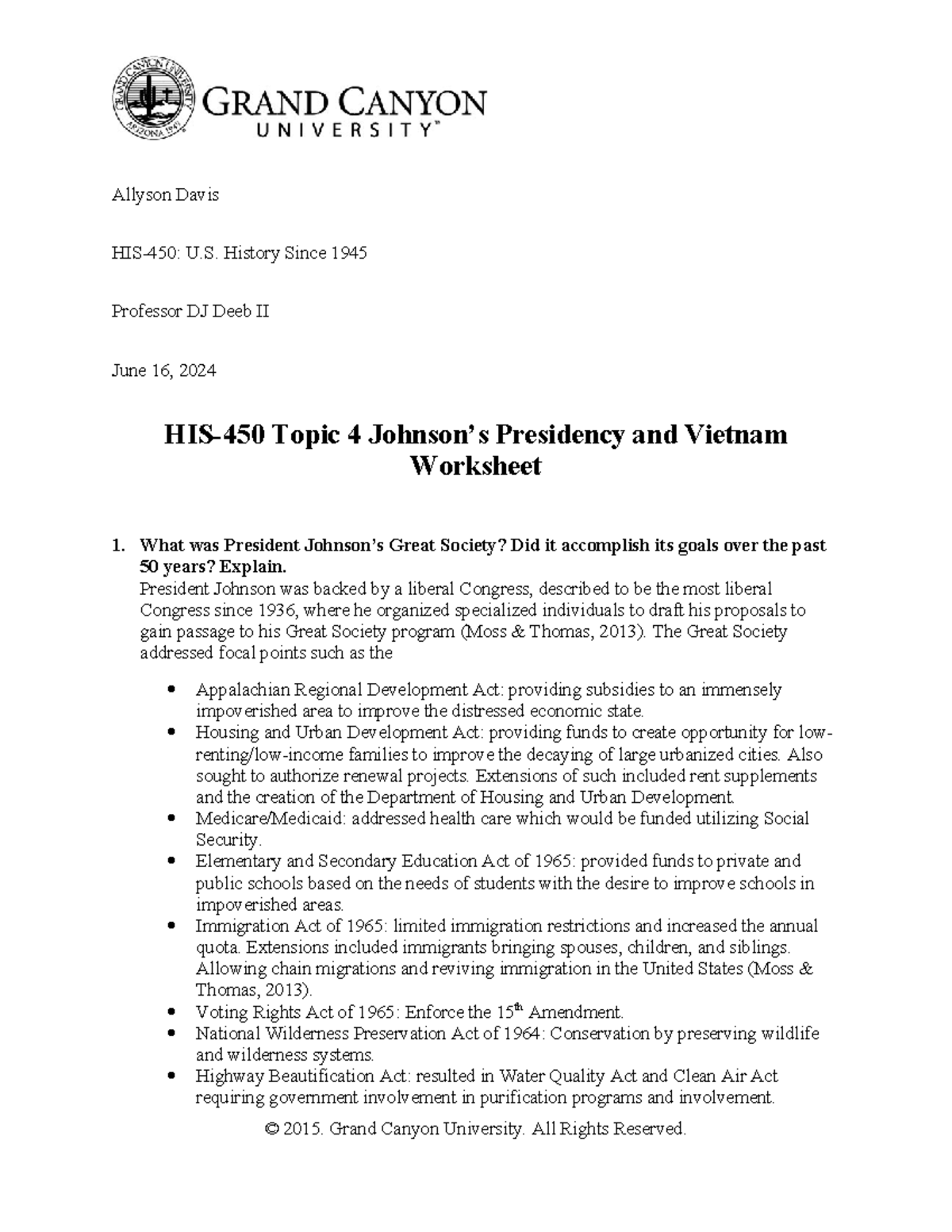 HIS 450 RS T4 Johnson s Presidencyand Vietnam Worksheet Allyson Davis