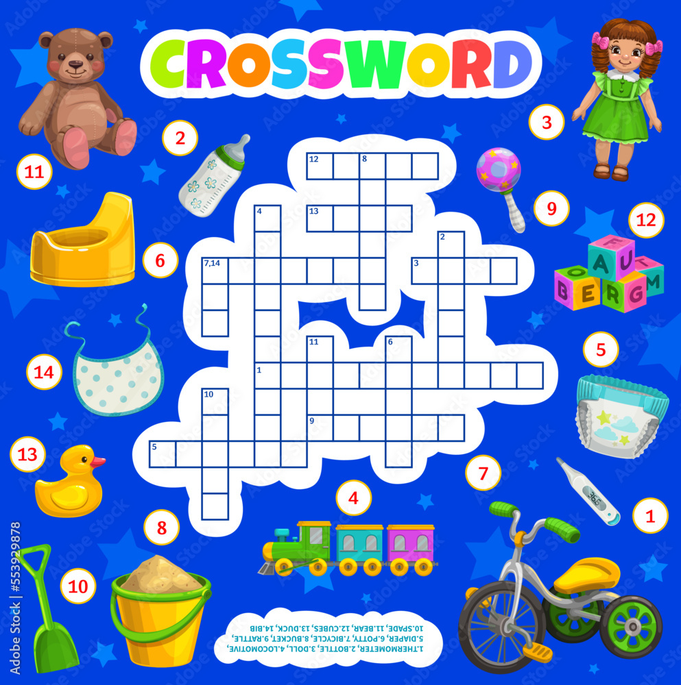 Kids toys and accessories crossword puzzle worksheet find a word quiz