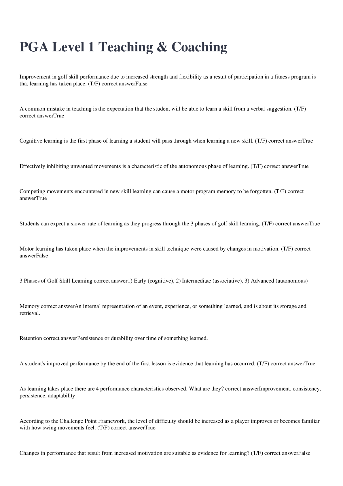 PGA Level 1 Teaching Coaching exam 2022/2023 with 100% correct