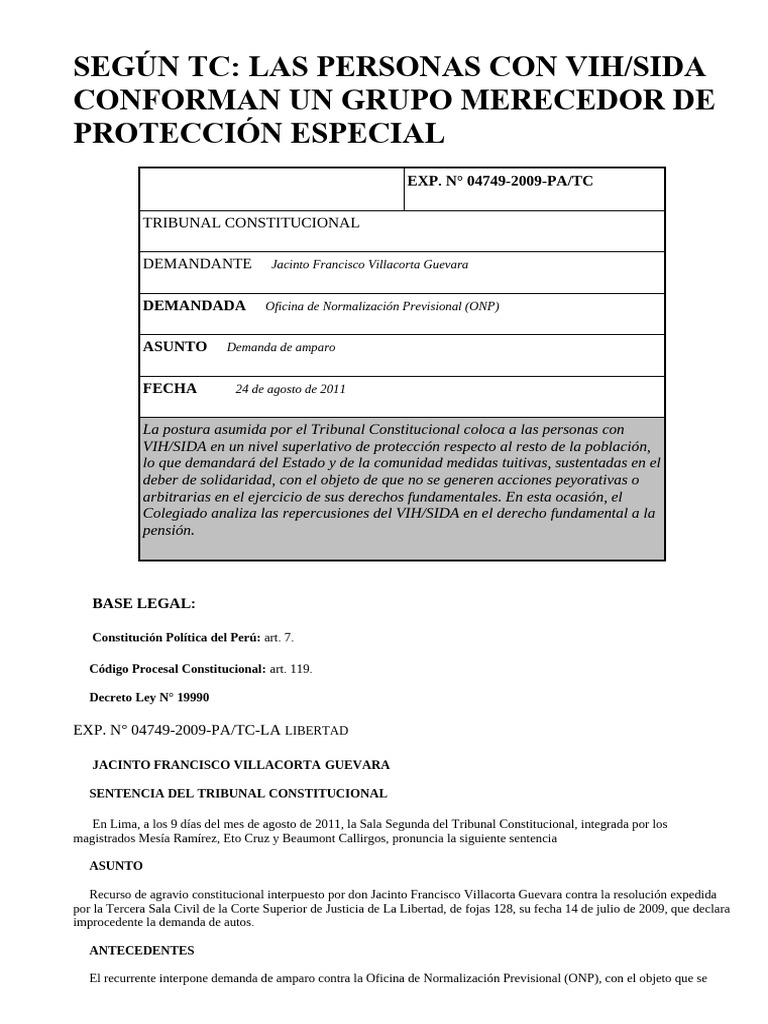 DJ 2011 156 SEGÚN TC LAS PERSONAS CON VIHSIDA CONFORMAN UN GRUPO