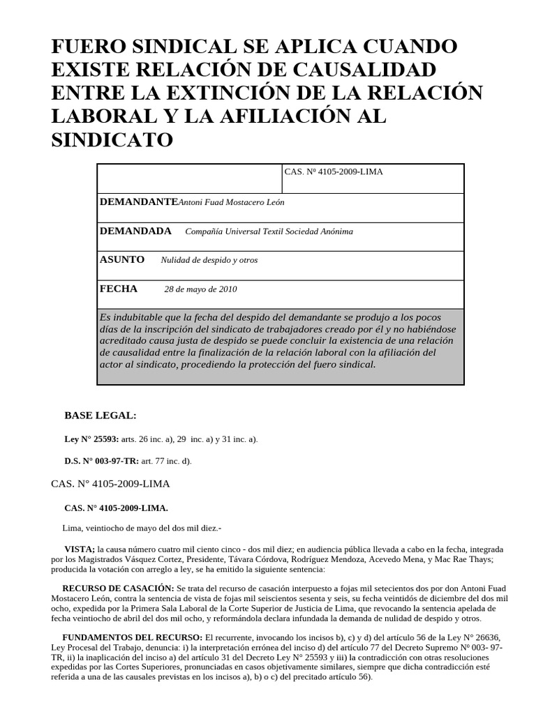 DJ 2011 156 Fuero Sindical Se Aplica Cuando Existe Relación de