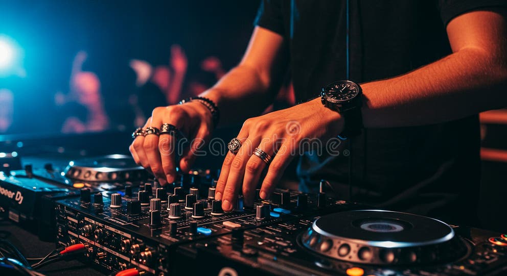 DJ Using a Mixer with Multiple Knobs and Sliders Adjusting Sound