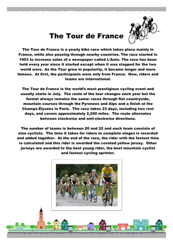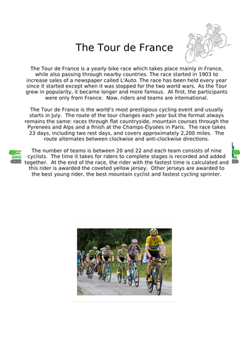 Tour de France Reading Comprehension Crossword Wordsearch Activity Pack