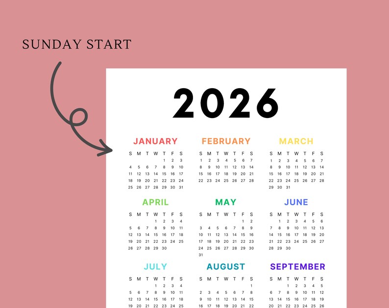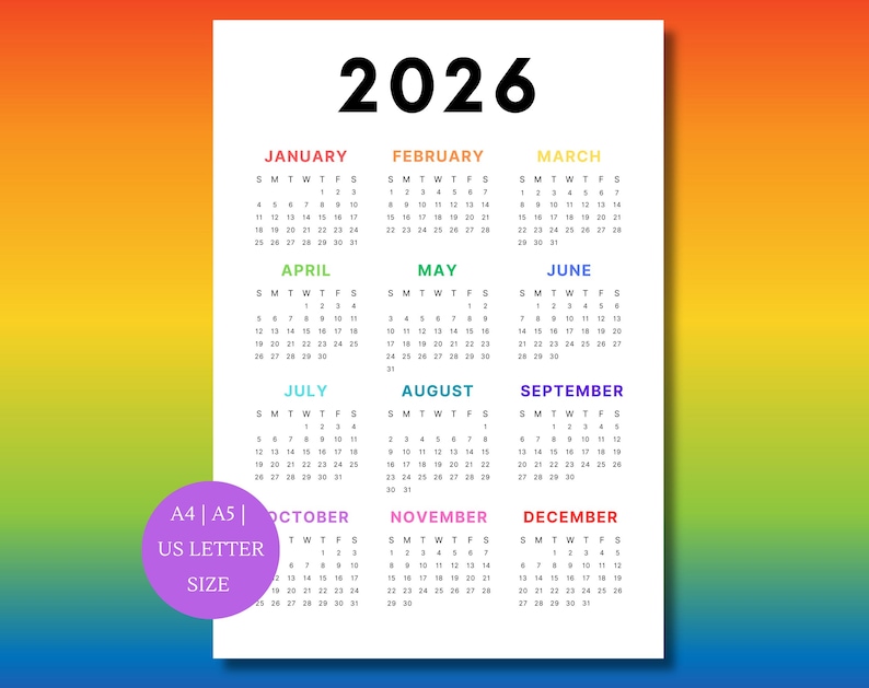 2026 Calendar Single Page Full Year Calendar Desk Calendar Wall