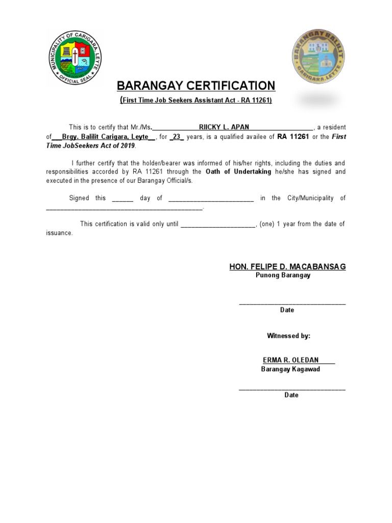 Barangay Certification Template PDF